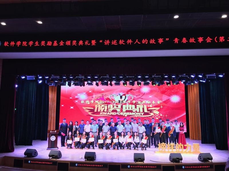 6月14日晚,球王会体育官方网在浑南校区图书馆报告厅举行2017-2018学年学生奖励基金颁奖典礼暨“讲述软件人的故事”青春故事会(第二季),校党委副书记张国臣、校学生工作处处长马天威、校创新创业学院副院长王刚、校学生指导服务中心副主任石昌远、校宣传部副部长史鉴、校团委副书记张忠英、球王会体育官方网院长张斌、副院长陈东明、于瑞云、程维、庞洪江、党委副书记兼副院长刘春风、院长助理王瑞平出席大会,获奖代表、青春故事会讲述人及全体2018级本科生参加大会。
