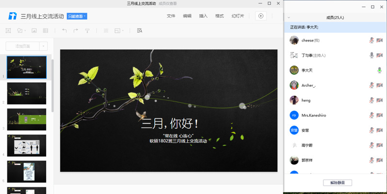 各班同学欣赏抗疫公益歌曲,朗诵抗疫诗歌《中国阻击战》,表达了对光明未来的坚定信心和衷心期盼。同学们分享自己在家生活、学习科研的小片段,同时对今后一段时间的居家防疫提出了行之有效的建议,并就个人在疫情期间的学习生活以及科研中遇到的问题进行了分享和讨论。