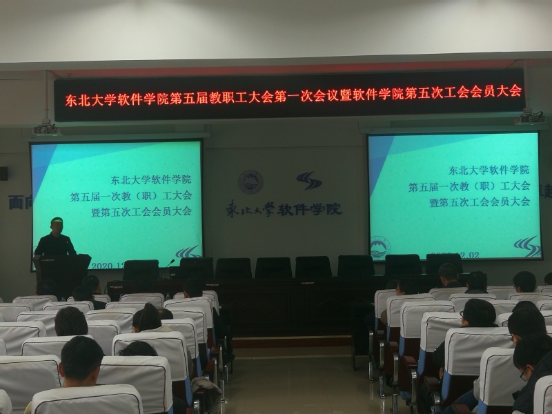 2020年12月2日下午,软件学院第五届教职工大会第一次会议暨球王会体育官方网第五次工会会员大会在浑南校区信息学馆B520召开。文法学院党委书记隋永强、教代会执委江河建筑学院党委书记安立鸿、校工会副主席孙东来、工商管理学院工会主席辛冲、计算机科学与工程学院工会主席信俊昌出席,球王会体育官方网全体教职工参加了会议。
