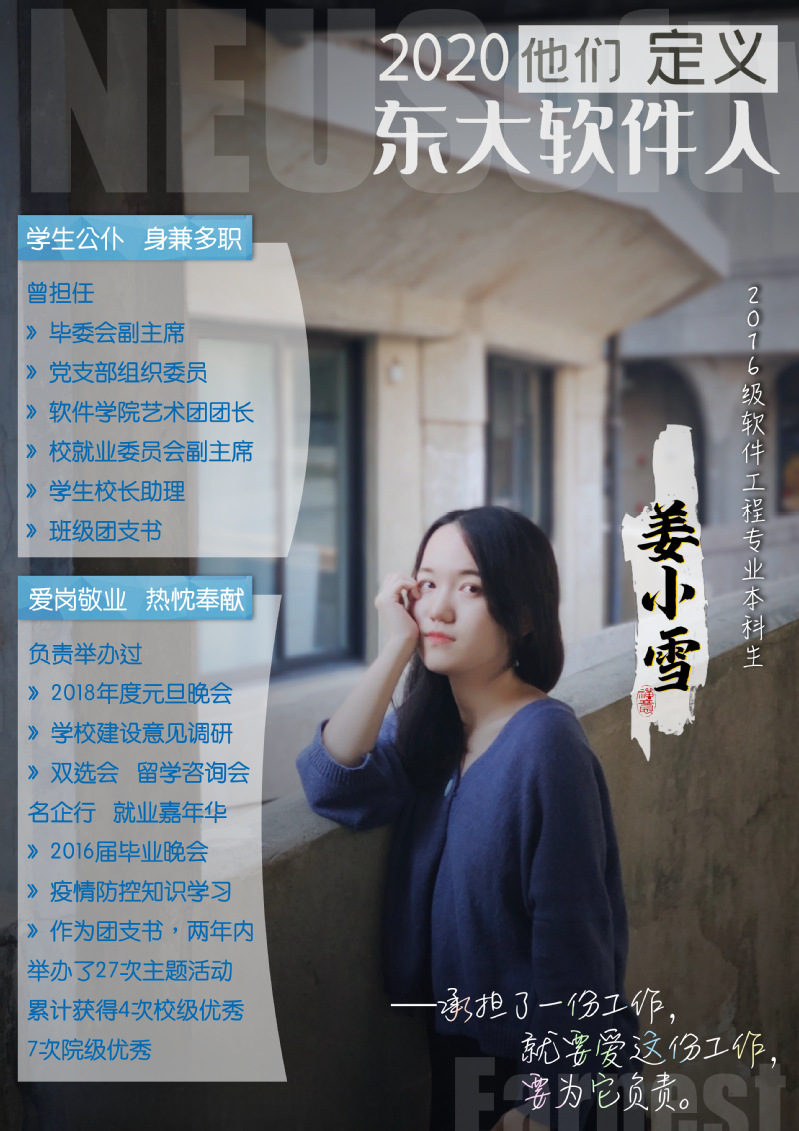 忙碌的身影如音符悦动,活动精彩纷呈,工作会议不紊有条,你总是能看到她。大学四年里,从未耽误过任何一项工作,忙到再晚也从没有过一句怨言,是她,球王会体育官方网2016级本科生姜小雪。