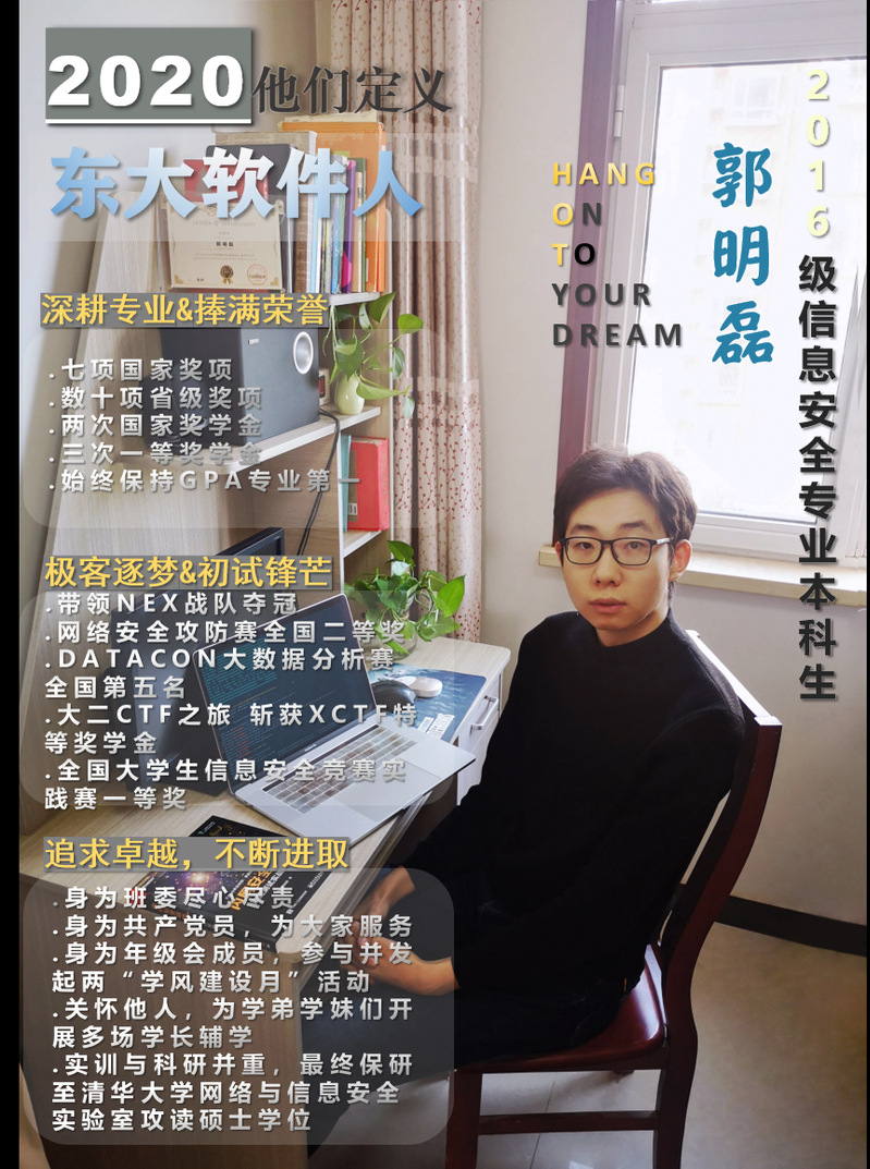大二寒假,在学长的引领下,他开始了自己的CTF之路。寒假期间,他坚守在学校,不断汲取着专业知识,调试新的漏洞。但现实是残酷的,大二下学期的几次比赛,都让郭明磊尝到了苦涩。“莫待宝剑未佩妥,出门却已是江湖”,郭明磊只有一个想法:不能让NEX战队在他们手里衰落。