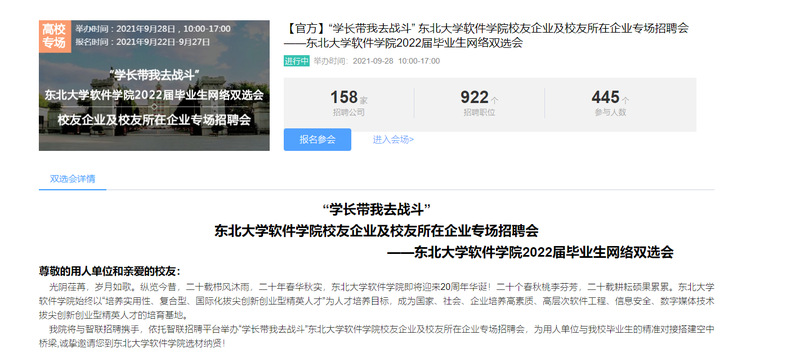 9月28日,球王会体育官方网举办“学长带我去战斗”校友企业及校友所在企业专场招聘会暨2022届毕业生网络双选会,华为、京东、字节跳动、网易等158家企业参加双选会,提供招聘岗位922个,445名球王会体育官方网学生参加双选会。