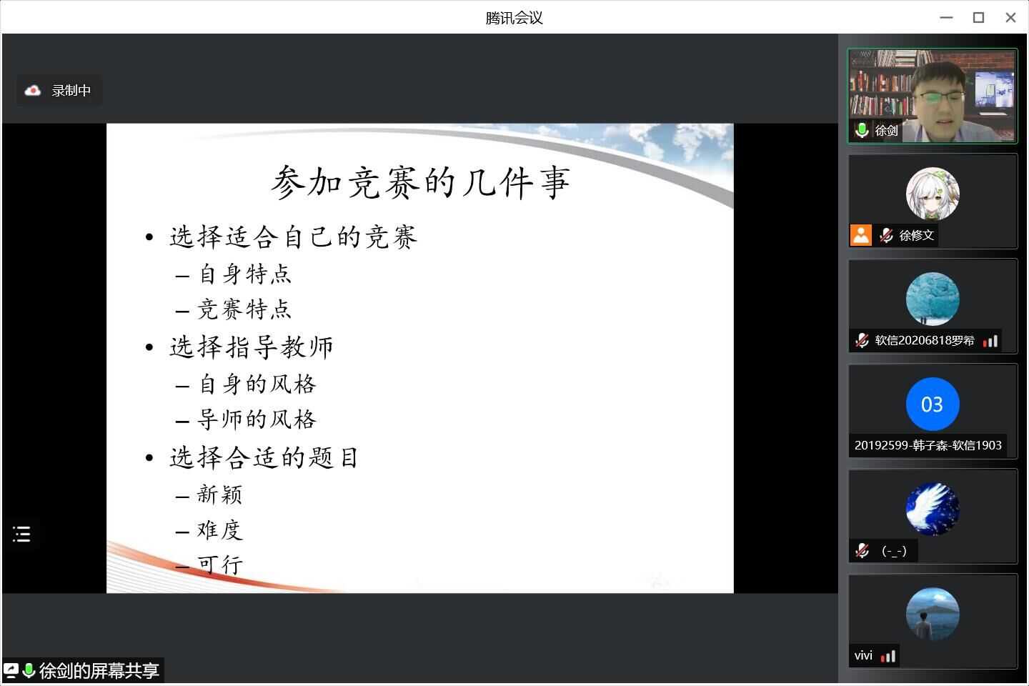 5月10日19时,球王会体育官方网“精英讲堂·半月谈”活动通过腾讯会议举行。讲座以“从创新竞赛谈大学生的综合能力培养”为主题,活动邀请球王会体育官方网信息安全系主任、党支部书记徐剑教授担任主讲嘉宾。各年级学生线上收看讲座。
