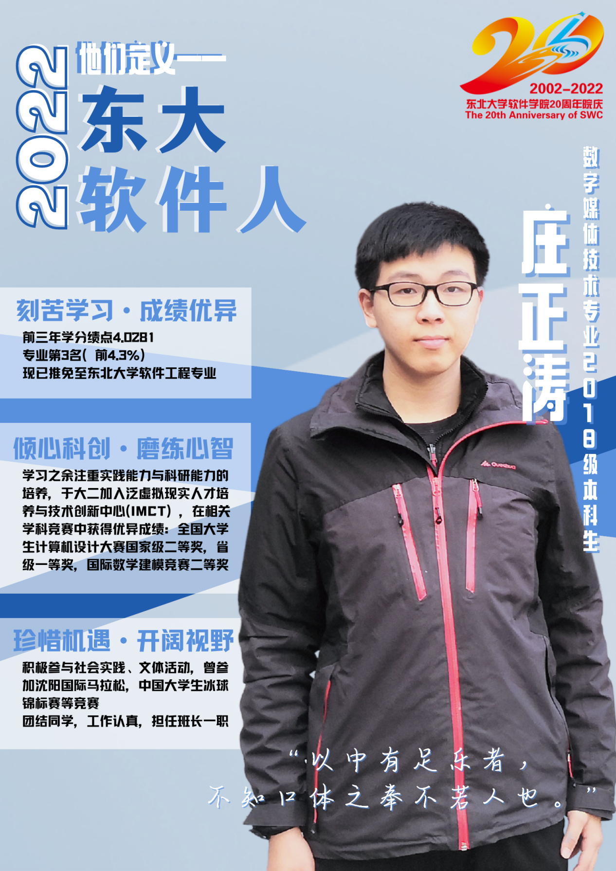 2018年9月,庄正涛踏上了求学之路。初入球王会体育官方网,面对崭新的环境和来自五湖四海的同学,他的内心迷茫且自卑。生活在城市中的同学可能无法理解一个农村孩子的成长历程,进入大学前的庄正涛几乎没有接触过计算机,更不用说用它完成晦涩难懂的专业课程。他也因此陷入低谷,在大一下学期的时候,绩点一度来到了2.7。但是他最终明白了,“我们登上的并非我们所选择的舞台,演出并非我们所选择的剧本”,而帷幕已经拉开,故事已经开始,那就坚强的站起来,向着自己的目标努力奔跑。