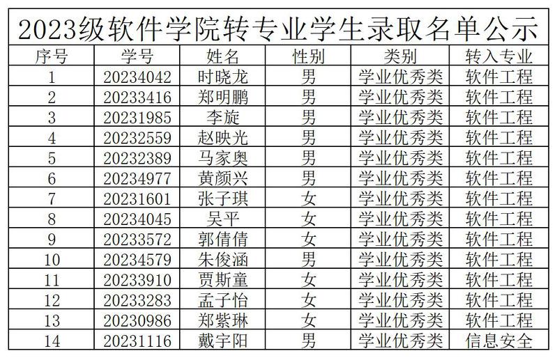 2023级球王会体育官方网转专业学生录取名单公示