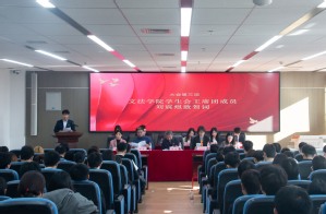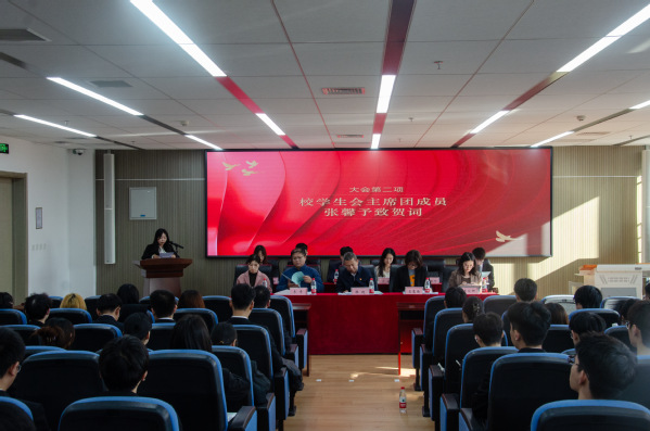大会在雄壮的国歌声中拉开帷幕。校学生会主席团成员张馨予代表校学生会致贺词,文法学院学生会主席团成员刘宸煜代表兄弟学院学生会致贺词。